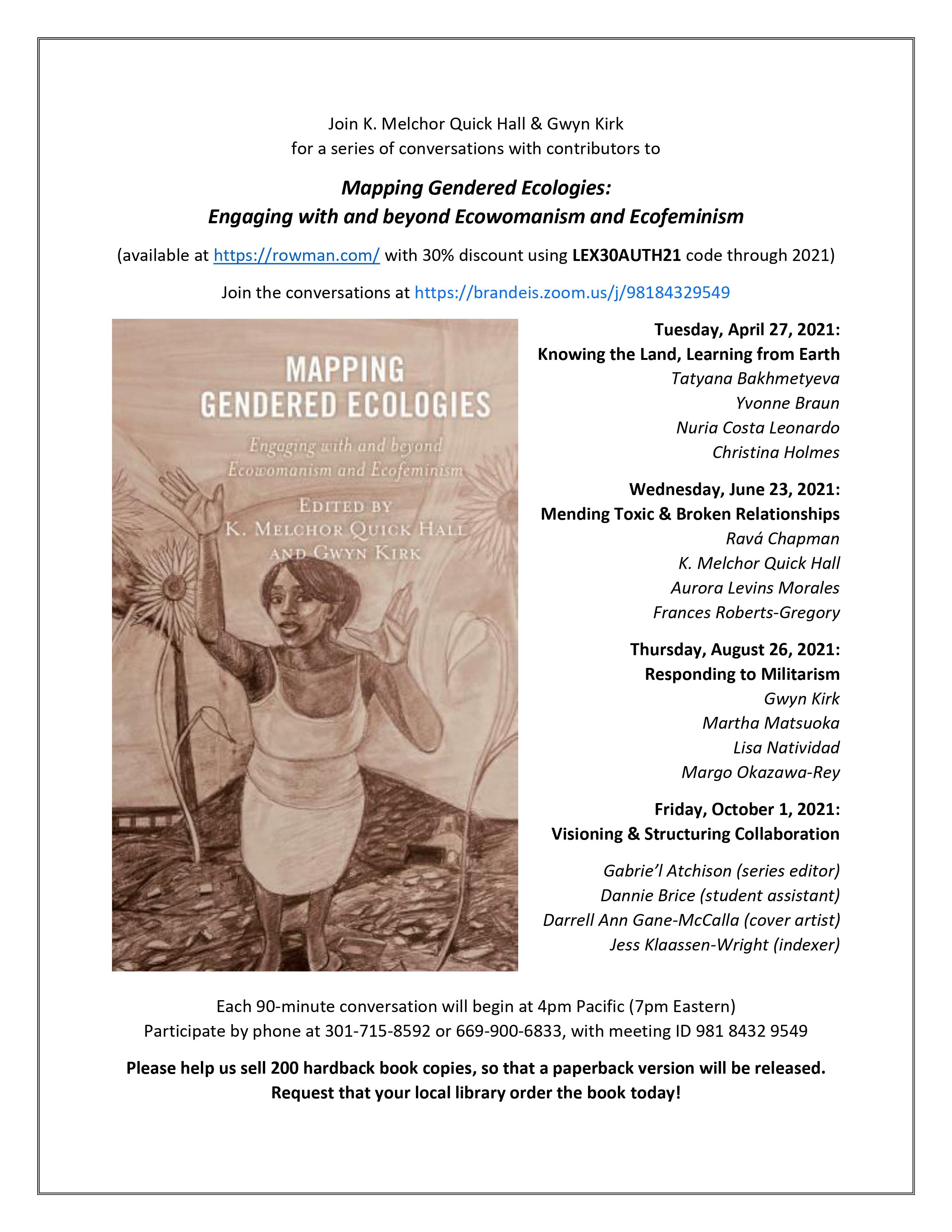 Co-editors K. Melchor Quick Hall and Gwyn Kirk are hosting a series of conversations about Mapping Gendered Ecologies. The goal is to reveal the interdependent relationships that connect our work and our worlds. We hope that you will join us for one of the upcoming conversations.